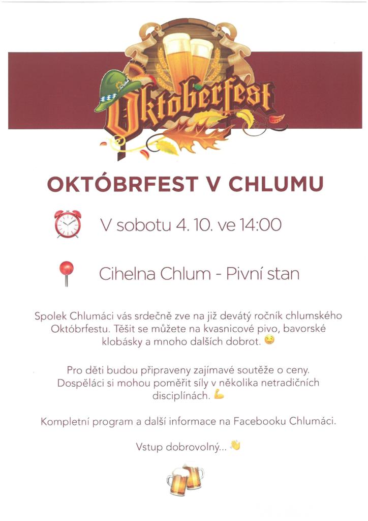 Spolek Chlumáci Vás srdečně zve na 9. ročník chlumského Októbrfestu. Těšit se můžete na tradiční občerstvení i bohatý program pro děti i dospělé.